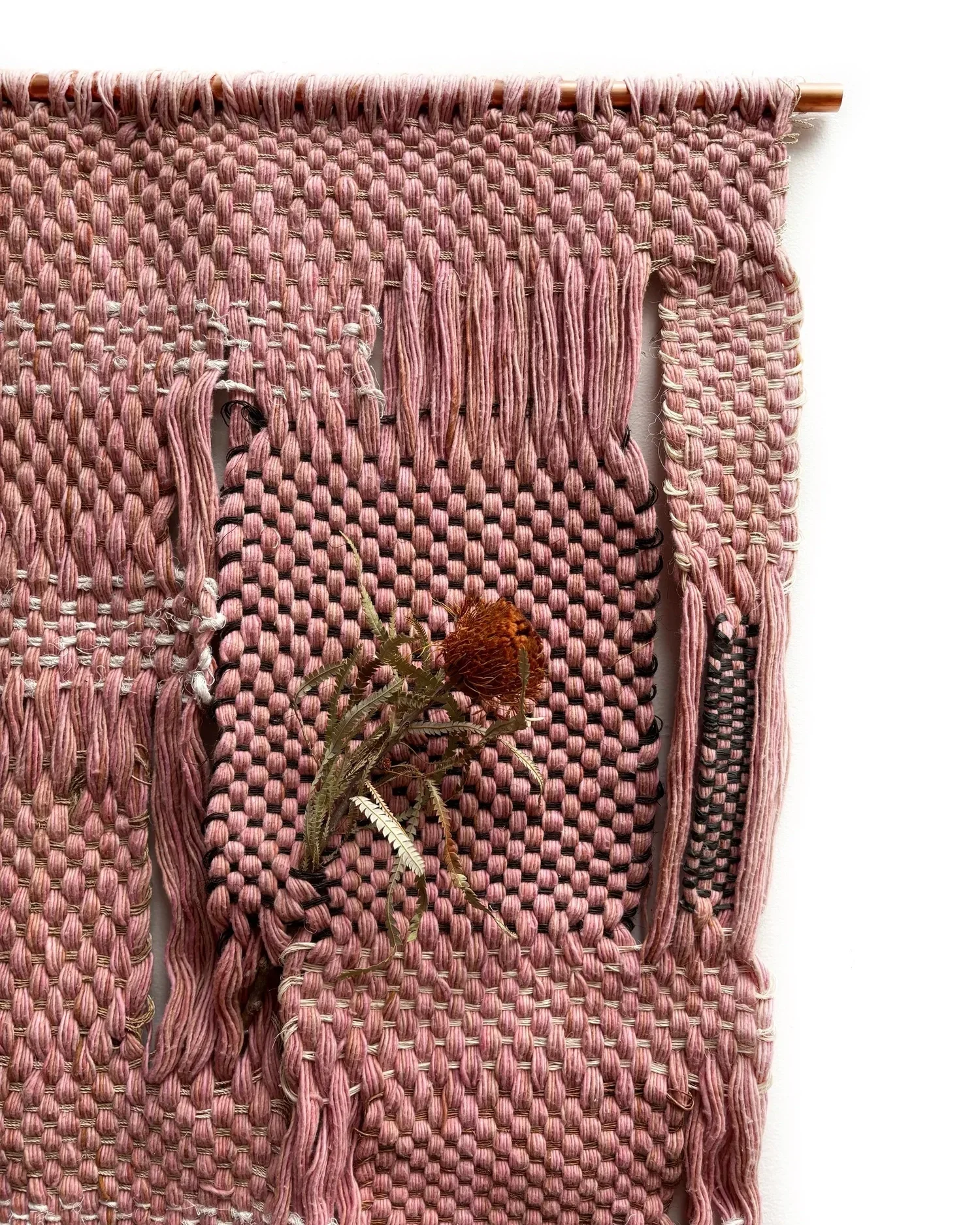 Jessie’s practice is deeply rooted in material exploration, memory, and an intuitive relationship with color and texture. Between 2021 and 2024, she embarked on a daily practice of creating small woven artworks for varying durations. The resulting handwoven drawings or “thread sketches” are visual journals that mark fleeting moments through color, gesture, and materiality. She incorporates found materials from nature into the surface of her weavings, transforming each piece into a tactile collage that blurs the line between textile and sculpture.