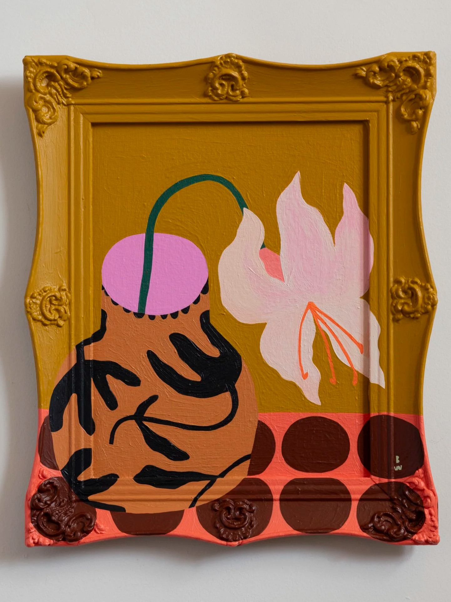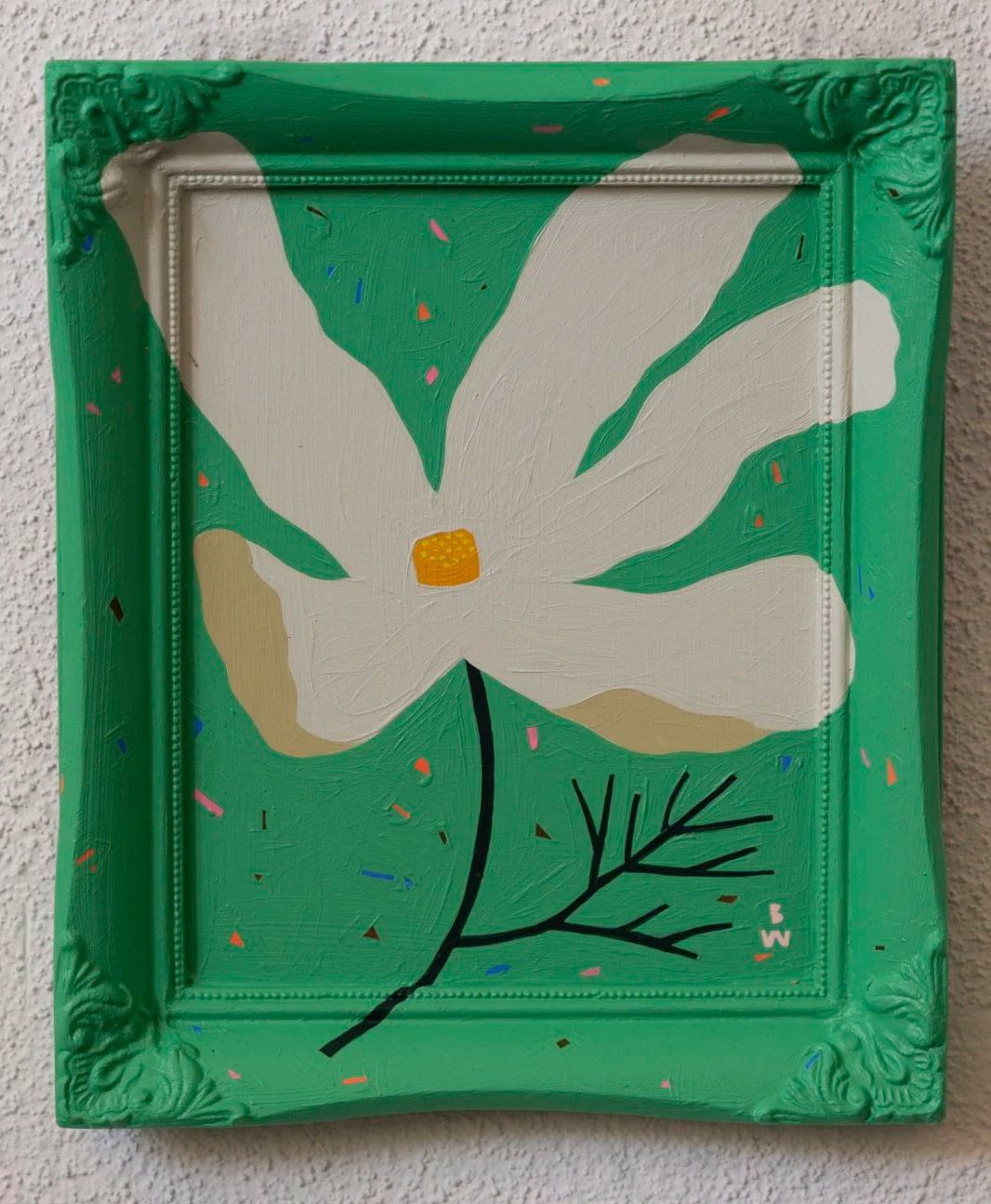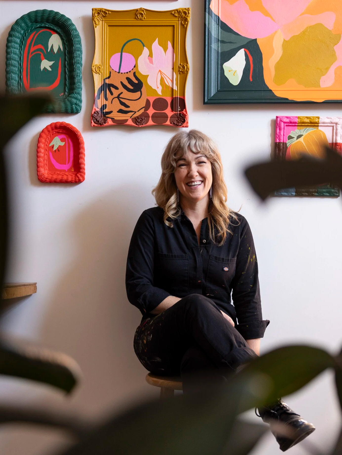 Bekah Worley is a Minneapolis-based artist whose color-forward paintings explore botanical themes, folk art patterns, and an underlying belief in joy. She works mainly in acrylic, loves incorporating found objects into her art, and painting on unique surfaces, such as ornate, vintage frames. She often experiments with color and can be found in her studio surrounded by take-out containers of custom mixed colors. She is represented by the Liz Lidgett Gallery, sells her work online and at local events, while also keeping art accessible and offering prints and stickers. She has collaborated with organizations and artists, such as Docomomo, Stoic Cider, Biota Goods, A Mano, and Korppi Coffee. Learn more about Bekah at bekahworley.com or follow her on Instagram @bekahworleyco.