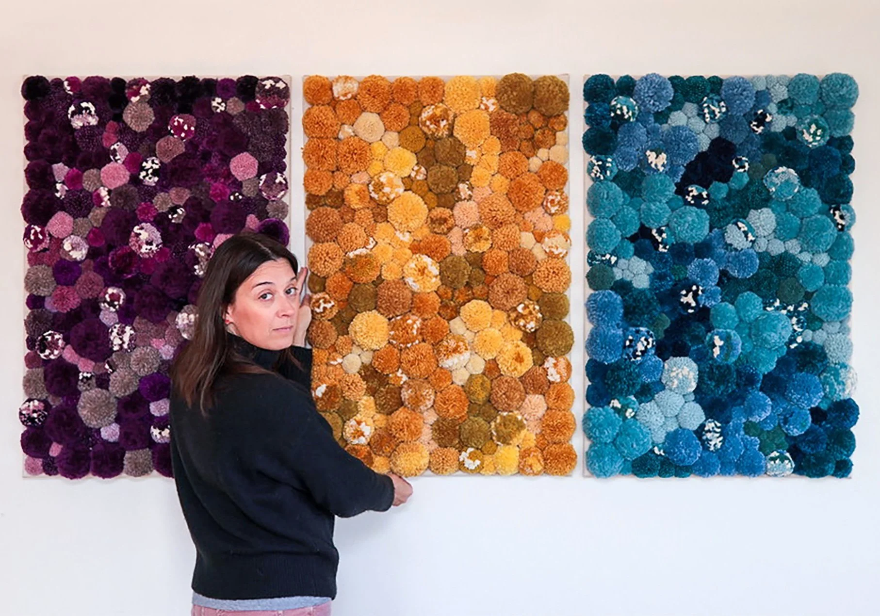 I always start with color and texture. With my recent pom pieces, I’ve been starting out by making a few poms in a variety of colors and textures. They serve as a paint palette for me, and I like to start this way because it’s pretty low entry. I can take what I would probably consider a pretty wild and crazy combination of colors and quickly see how they work together. Then I can ask myself questions: Do I want to lean into one color or make this more multi-colored? Do I have enough texture? Does it need more white, cream, or negative space? Sometimes I incorporate macrame cord because it’s neutral in color, but it also has a bulky and wild texture compared to yarn. So yeah, I try to start with a set of materials that have a good mixture of color and texture, then let it evolve from there.